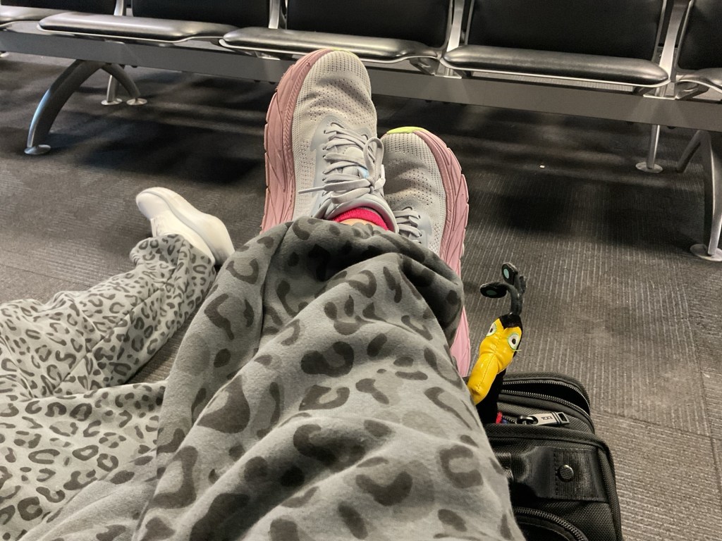 OOOH! The Subway is opening up! The scent of fresh bread baking is wafting through the terminal joined by the sweet sent of that black magic, coffee! More people are starting to arrive, and while my husband quietly snores (first time I have used that phrase to describe his snoring) some of the other weary travelers are starting to stir from their airport floor rest.